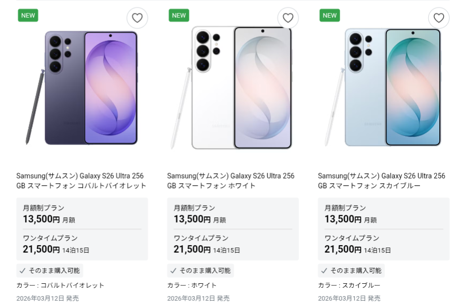 そこでこの記事では、日本・韓国でGalaxy Ultra シリーズを取り扱っているレンタルサービスを紹介します。なんと、最新のS26Ultraもすでにレンタル開始しています。