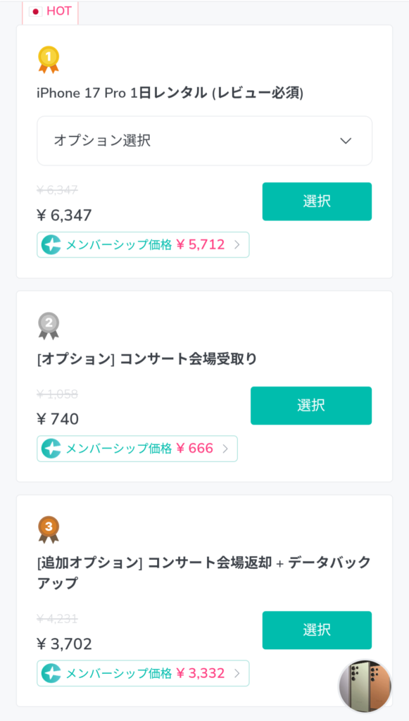 - 現地で受取:予約バウチャーを提示してスマホを受け取ります(モバイルバッテリーなどの付属品付き!)。